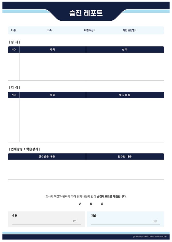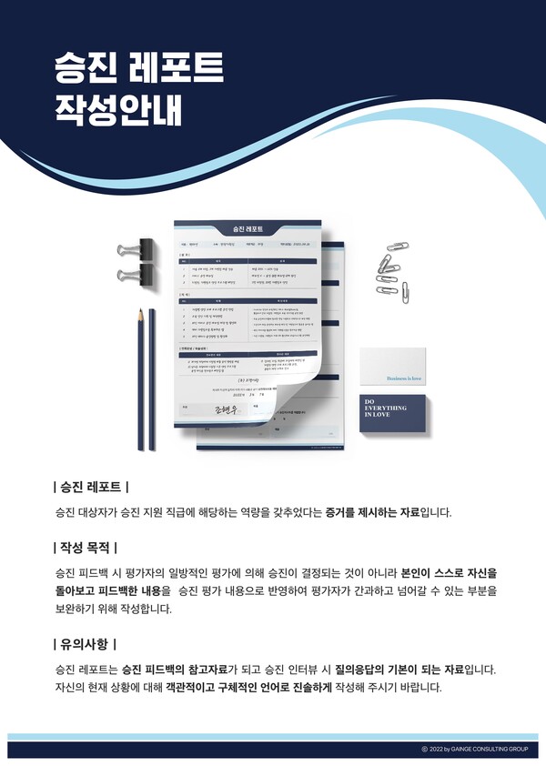 이번에 소개해 드릴 승진레포트는 승진 대상자가 먼저 자신을 돌아보고 피드백을 해서 자신의 역량을 평가자들에게 보여주는 도구이다.