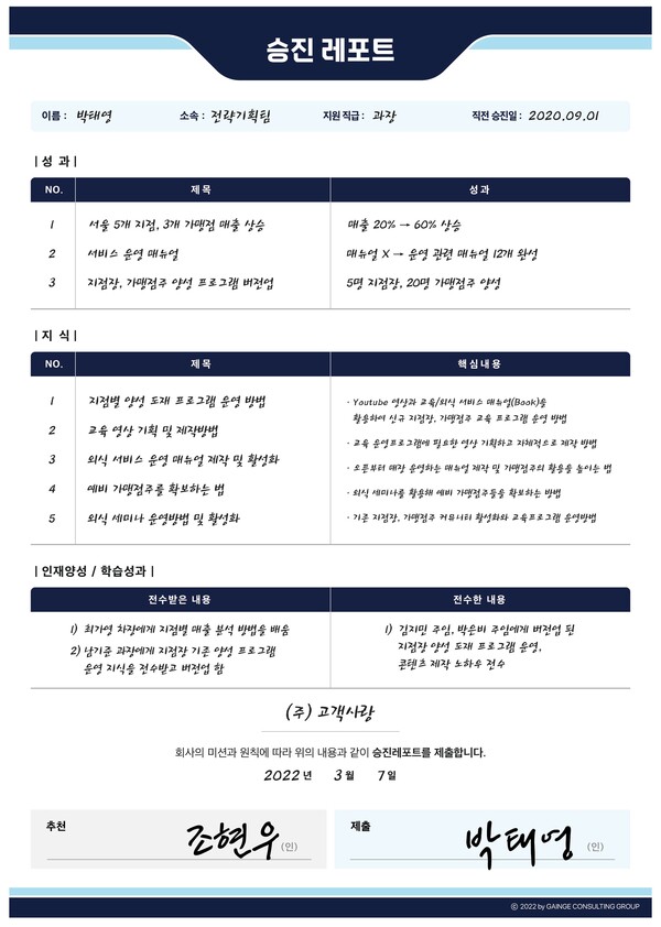 자신이 전수받은 내용, 자신이 학습했고 성장한 내용과 함께 다른 멤버들을 성장시킨 것을 보여주는 것이 승진 레포트의 중요한 포인트가 된다.