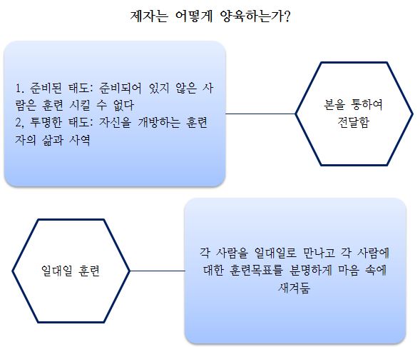 경영자나 관리자, 혹은 팀장은 일을 하는 과정 자체를 통해서F2에게 “보여주는 교육”을 해야 한다. 그러므로 예수님의 제자훈련은 철저하게 현장 중심이다. 여기에서 소크라테스의 아카데미와 확연히 차별화된다.