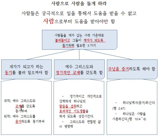 제자로 성장하고자 하는 동기를 불러일으키는 것이 가장 먼저이고, 정기적은 교제가 있어야 한다. 그리고 복음을 전하는 경험을 하도록 하는 것이다. 이것이 순환적으로 반복될 때 제자로 성장할 수 있다.