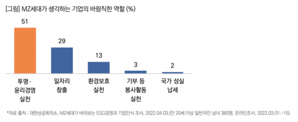 MZ세대가 생각하는 기업의 바람직한 역할로 ‘투명‧윤리경영 실천’(51%)이 1위로 꼽인 것으로 조사됐다.