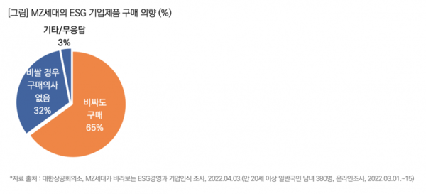 MZ세대 3명 중 2명(65%)은 가격이 더 비싸더라도 ‘ESG를 실천하는 기업 제품을 구매할 의사가 있다’고 답해 사회적 트렌드인 ESG에 대한 MZ세대의 높은 관심도를 보여줬다. 반면 ‘비쌀 경우 구매의사가 없다’는 의견은 32%로 긍정적 답변보다 훨씬 적었다.