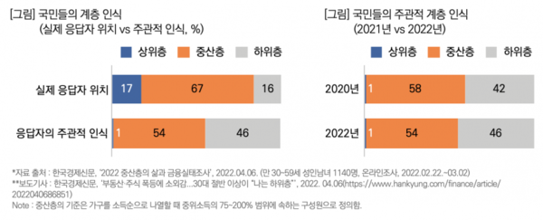 2020년과 2022년의 조사결과를 비교하면, 자신을 중산층으로 여기는 사람이 줄고(4%p), 하위층으로 보는 비율은 더 증가하였다(4%p). 그만큼 주식, 암호화폐 증 자산 폭등기에 혜택을 받지 못한 박탈감 등이 반영된 것으로 해석된다.