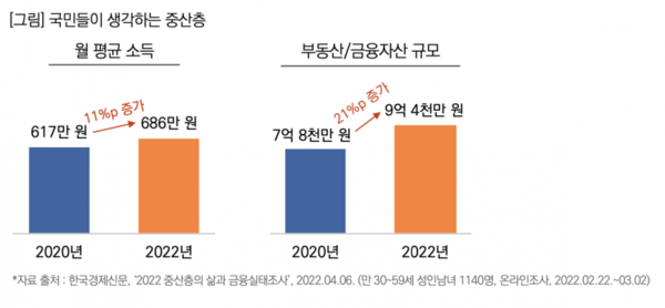 국민들이 생각하는 중산층의 월평균 소득은 686만 원으로 2년 전 조사 대비 11%p 높았다.