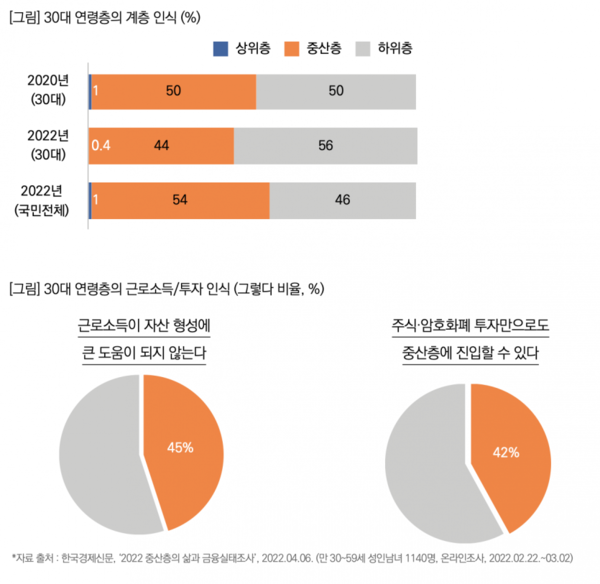 또, 5명 중 2명꼴(42%)로 주식·암호화폐 투자만으로도 중산층에 진입할 수 있다고 생각하는 점이 특징적이었다.