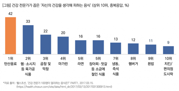 건강 전문가가 말하는 피해야 할 음식 1위로 탄산음료, 2위 햄·소시지, 3위 곱창인 것으로 조사됐다.