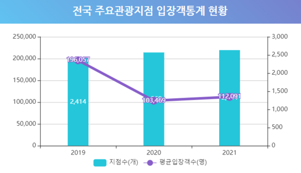 국내도 별반 다르지 않다. 관광지식정보시스템의 전국 주요관광지점 입장객통계 현황에 따르면, 2019년 대비, 2020년, 2021년 지점 별 평균 입장객 수가 거의 절반 수준으로 떨어졌다.