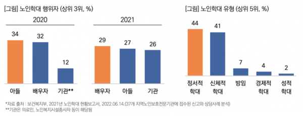 노인학대 행위자는 배우자(1위), 아들(2위), 기관(3위) 순으로 나타났는데, 주목할 점은 2020년(포함) 이전까지는 아들이 최다 가해자였는데, 2021년 처음으로 배우자가 아들보다 상위 순위로 올라서며 순위가 역전됐다.