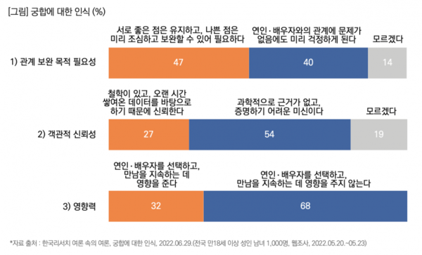몇가지 보기를 제시하고 궁합에 대한 국민들의 인식을 알아보았다. ‘서로 좋은 점은 유지하고 나쁜 점은 미리 조심하고 보완할 수 있어 필요하다’는 의견이 47%로 응답자 절반에 가까웠으나, 신뢰성에 대해서는 27%만이 동의하였다.