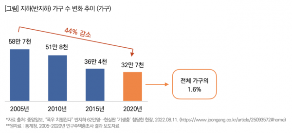 우리나라 (반)지하 가구 수는 2005년부터 지속적으로 감소 추이를 보이고 있으며, 2005년 58만 7천 가구 대비 44% 감소한 것으로 나타났다.