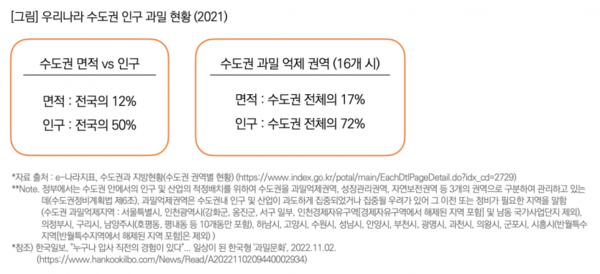 국토교통부의 ‘수도권과 지방현황(수도권 권역별 현황)’ 자료에 따르면 한국의 ‘수도권’ 면적은 전국 면적의 12%이나, 우리나라 전체 인구의 절반이 거주하는 것으로 나타났다.