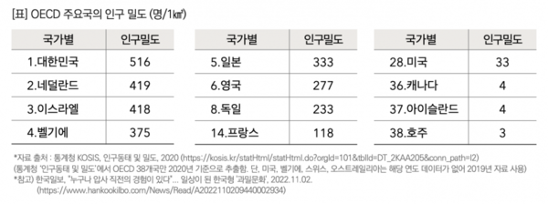 한국의 인구 과밀을 OECD 국가와 비교해 보았다. 우리나라의 인구밀도는 1㎢당 무려 516명을 기록해 OECD 38개국 중 단연 1위이다. 가로, 세로 각 1㎞ 사각형 안에 사람이 516명 들어차 있는 셈이다. 2위는 네덜란드로 419명, 3위 이스라엘 418명, 4위 벨기에 375명 등의 순으로 나타났다.