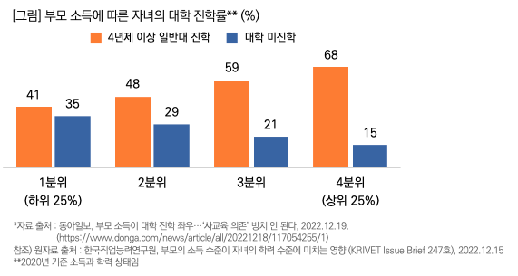 반면, 1분위(하위 25%) 가정 자녀의 경우 대학 미진학 비율이 4년제 이상 일반대 진학 비율 수준까지 올라온 것으로 나타났다.
