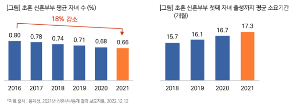 또, 신혼부부가 첫 자녀를 낳는 데까지 소요되는 기간도 2018년 15.7개월에서 2021년 17.3개월까지 늘었다. 2021년 기준 신혼부부가 첫째 자녀를 출산하는 데까지 평균 1년 5개월이 걸리는 셈이다.