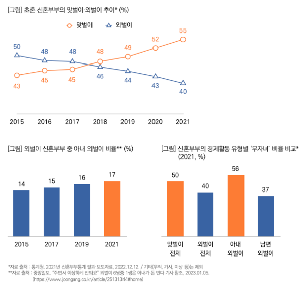 신혼부부의 경제활동 유형을 보면 ‘맞벌이’ 55%, ‘외벌이’ 40%였고, 전체 외벌이 부부 중 아내 혼자 벌이를 하는 신혼부부는 17%, 즉 외벌이 부부 6쌍 중 1쌍꼴로 아내가 생계를 책임지고 있었다. 소폭이기는 하나 ‘아내 외벌이 비율’이 2015년 14%에서 2019년 16%, 2021년 17%로 꾸준히 증가 추세를 보이고 있어 주목된다.