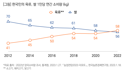 한국인 1인이 1년간 섭취한 육류는 2022년 기준 58kg로 1인당 쌀 소비량 56kg을 넘어섰다. 1인당 연간 육류소비량은 2012년 이후 42%나 증가한 데 반해, 쌀소비량은 20% 감소한 결과이며, 이 같은 육류소비량의 증가와 쌀 소비량의 감소는 앞으로도 계속 지속될 것이라고 한국농촌경제연구원은 전망했다.