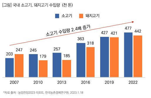 2022년의 국내 소고기, 돼지고기 수입량은 각각 47.7만 톤과 44.2만 톤으로 2007년 대비 각각 2.4배, 1.8배 증가했다.