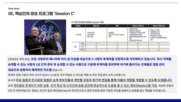 1970년도부터 GE는 모든 사업부의 매니저와 리더 급 이상을 대상으로 2~3명의 후계자를 선정하도록 의무화하고 있다. 즉시 직책을 승계할 수 있는 사람과 1년간의 준비 후 승계할 수 있는 사람으로 구분해 후계자를 준비하며 여기에 들어가는 인재들은 집중 관리 대상으로 분류되어 체계적인 지도를 받는다.