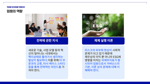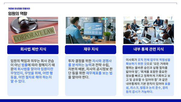 마지막은 임원의 역량이다. 경영자가 선택받은 거라고 볼 수 있다. 임원이라면 회사법에 대한 지식, 재무, 내부 통제 관련 지식, 전략에 관한 지식이 있어야 한다.
