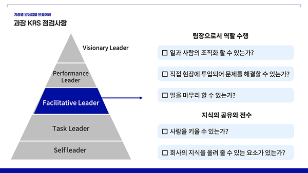 마지막으로 회사의 지식을 올릴 수 있는지를 봐야 한다. 직원이 30~100명 가까이 되면 퍼포먼스 리더가 필요하다. 윗 레벨부터 본부장, 센터장 혹은 부장이다. 이때부터 사업 관리가 핵심이다. 팀장은 프로젝트 관리 수행이다.