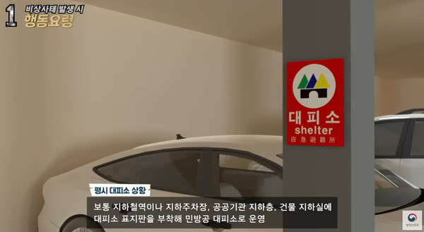 보통 지하철역이나 지하주차장, 공공기관 지하층, 건물 지하실에 대피소 표지판을 부착해 민방공 대피소로 운영하고 있으니 평소에 미리 인지하고 대피를 하면 된다.