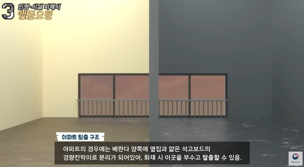 아파트의 경우에는 베란다 양쪽에 옆집과 얇은 석고보드의 경령 칸막이로 분리가 되어 있어, 화재 시 이곳을 부수고 탈출할 수 있다.