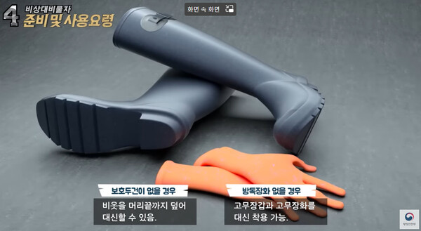보호 두건이 없을 경우 비옷을 머리끝까지 덮어 대신할 수 있다. 방독 장화가 없을 경우 고무장갑과 고무장화를 대신 착용 가능하다.