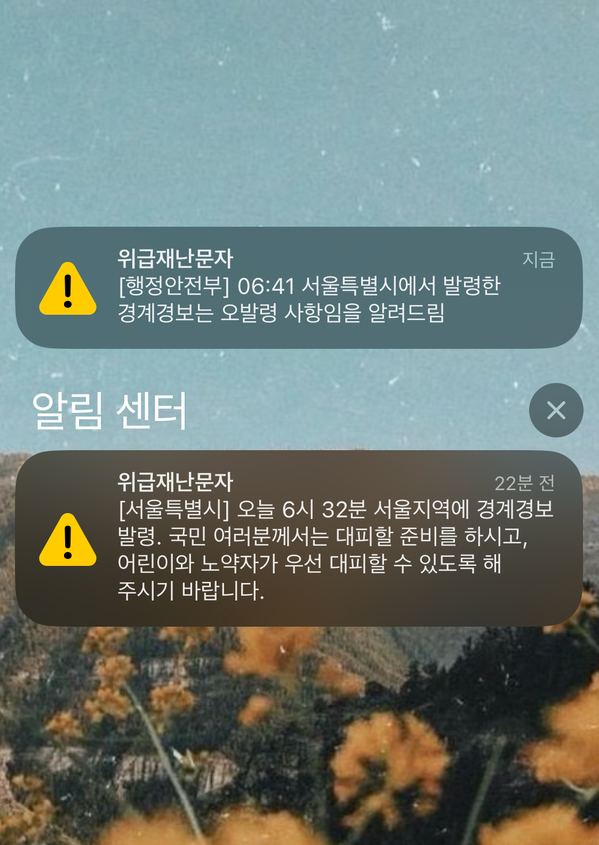 한편, 경계경보 오발령과 관련해 행안부 관계자는 "위급 재난 문자는 행안부와 지자체가 모두 발송할 수 있는데, 이번에 서울시 전역에 전송된 문자는 서울시가 오발송한 것"이라고 설명했다.