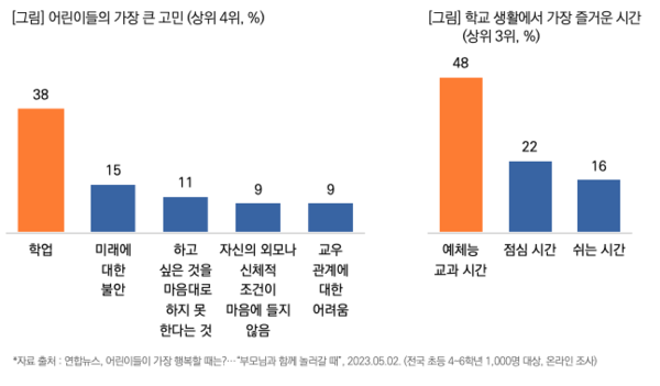 어린이들의 가장 큰 고민은 ‘학업’에 관한 것(38%)이었고, 이어 ‘미래에 대한 불안’ 15%, ‘하고 싶은 걸 마음대로 하지 못한다는 것’ 11%, ‘자신의 외모나 신체적 조건이 마음에 들지 않는 않음’ 등도 고민으로 꼽았다.