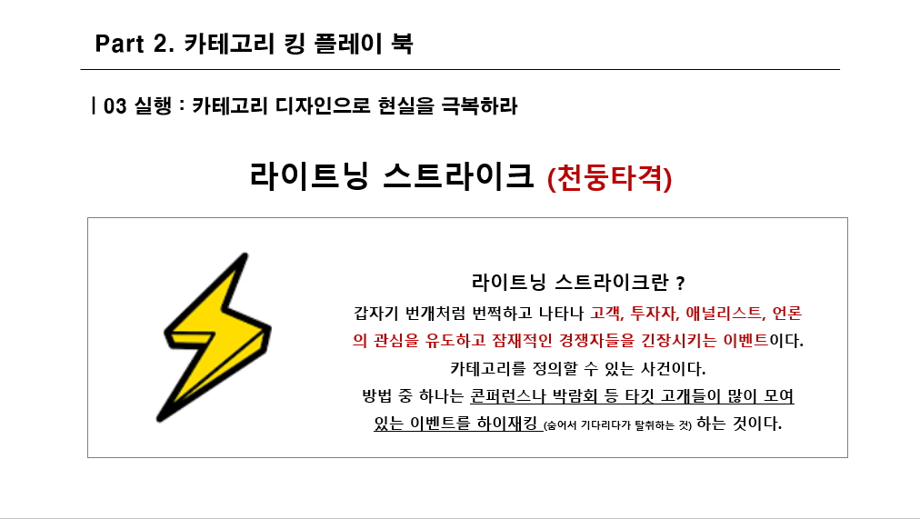 『카테고리 킹』저자는 라이트닝 스트라이크라는 용어를 사용합니다. 조금 더 한국식 표현으로 바꾸자면 천둥타격이라고 부를 수 있을 것 같습니다.