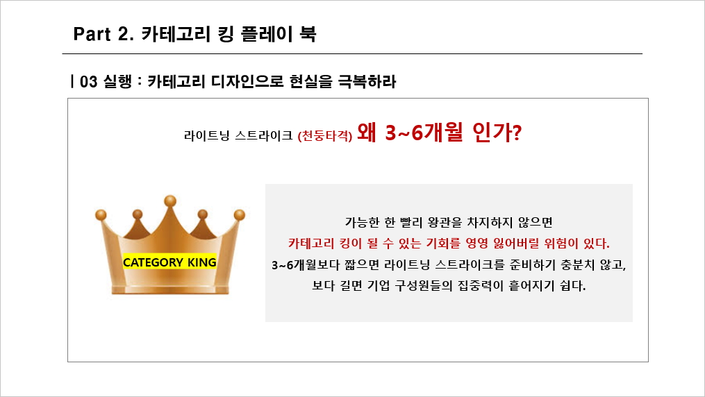 이 책의 저자는 현 시장에서는 기업의 카테고리를 새롭게 정의하고 POV가 설정되고 나면 힘을 응축해서 비축해 놓았다가 특정 시점에 고객이 깜짝 놀랄만한 천둥타격을 하는 것이 굉장히 중요하다고 주장합니다.