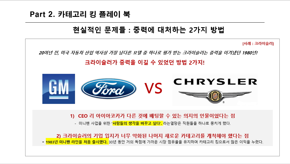 그렇기 때문에 미니밴이라는 카테고리는 말이 안되는 것이었습니다. 하지만 크라이슬러는 사람들의 생각을 바꾸는 작업을 했습니다. 지속해서 ‘밴’과 ‘미니밴’의 차이를 심어주어, 이제는 미니밴이 하나의 카테고리로써 통용되는 단어가 된 것입니다. 이를 통해 30년 가까이 독점에 가까운 점유율로 카테고리 킹의 자리를 지킬 수 있었습니다.