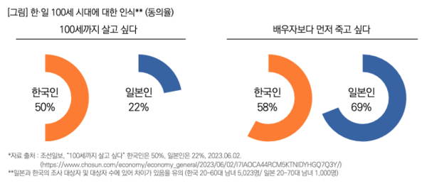 한일 양국의 100세 시대 인식은 어떤 차이를 보일까? 조선일보가 한국의 성인 남녀 5,023명을 대상으로 올해 5월에 실시한 ‘100세 시대 인식’ 조사 결과와 일본 호스피스 재단이 2023년 3월 일본인 1,000명을 대상으로 실시한 설문조사 결과를 비교해 보았다.