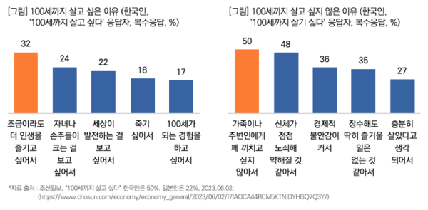 한국인의 ‘100세까지 살고 싶은 이유’로는 ‘조금이라도 더 인생을 즐기고 싶어서’를 가장 많이 꼽았고, 다음으로 ‘자녀나 손주들이 크는 걸 보고 싶어서’, ‘세상이 발전하는 걸 보고 싶어서’ 등의 순이었다.