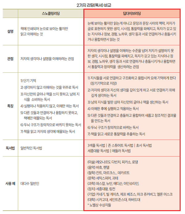 이들의 딥다이브리딩 독서법(3색줄독서법)을 배우고 익혀서 여러분의 생각을 확장하고 창의성과 통찰력으로 확대시켜야 합니다.