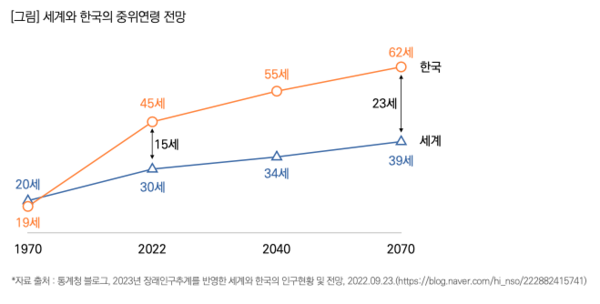 통계청에 따르면 우리나라의 중위연령은 1970년 19세, 2022년 45세, 2040년 55세, 2070년 62세로 한 세기 사이 3배 이상 급증할 것으로 예측했다.