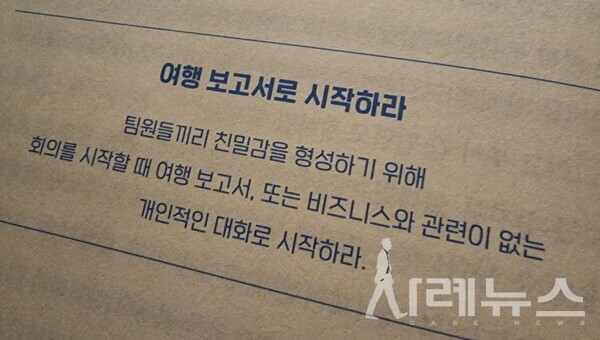 코칭에 도전하고 있는 내게 많은 도움이 될 것이라고 추천해준 책이다. 책에 "여행보고서로 시작하라"는 챕터가 있다. 한 기업의 문화에 대해서 이야기하는 장이었는데, 매주 월요일에 하는 회의의 시작을 주말에 다녀온 여행, 취미 생활, 가족들과의 에피소드 등 다양한 이야기를 나누면서 시작한다고 한다.