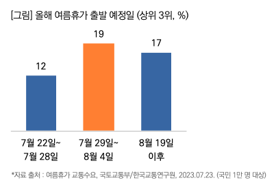 최근 국민 1만 명을 대상으로 국토교통부와 한국교통연구원이 여름휴가 교통수요를 발표했는데, 올해 여름휴가 출발 예정일로는 ‘7월 29일~8월 4일’이 19%로 가장 많았고, 그다음으로 ‘8월 19일 이후’, ‘7월 22일~28일’ 순이었다.