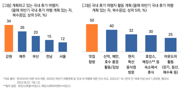 국내 휴가 계획 지역(복수응답)으로는 ‘강원’(34%)이 가장 인기가 많았고, 다음으로 ‘제주’(26%), ‘부산’(20%) 등의 순이었다. 특히 부산의 경우 도시 지역인데도 불구하고 3위로 꼽힌 점이 주목된다.