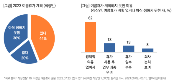 모든 직장인이 휴가를 가는 것은 아니다. 최근 발표된 직장인 휴가 계획 설문 조사 결과를 살펴보면 올해 여름 휴가 계획이 있는 직장인은 44%에 불과했다. 휴가 계획이 없거나 아직 정하지 못한 가장 큰 이유는 ‘경제적 여유 없어서’가 64%로 다른 이유보다 매우 높게 나타났다.
