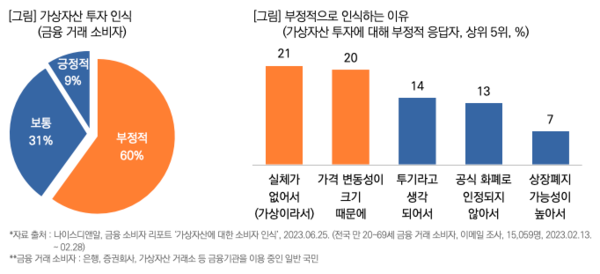 부정적으로 인식하는 이유로는 ‘자산의 실체가 없어서’(21%)와 ‘가격 변동성이 크기 때문’(20%)이라는 응답을 가장 많이 꼽았고, ‘투기라는 인식’, ‘비공식 화폐’ 등의 요인이 뒤를 이었다.
