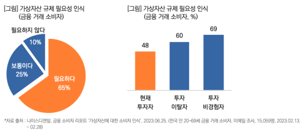 가상자산 규제 필요성을 묻는 질문에 대해 응답자 65%는 ‘필요하다’고 보았다. 다만 현재 가상자산에 투자 중인 사람보다는 비경험자(69%), 투자 이탈자(60%)가 규제 필요성을 더 강하게 느끼고 있었다.