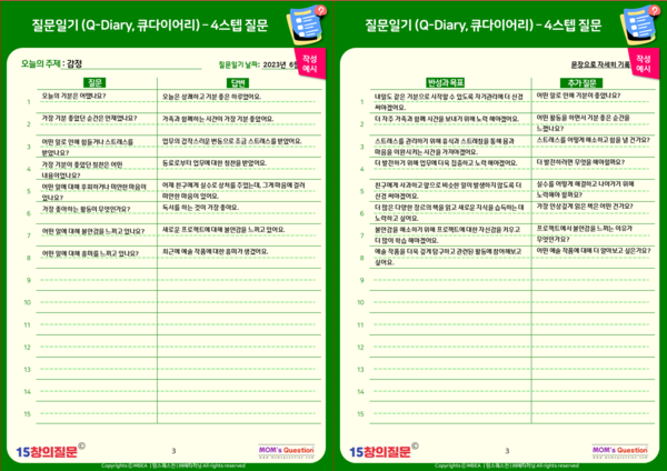다음은 3색줄독서 질문도구에서 활용하는 질문일기(4스텝질문) 샘플입니다.