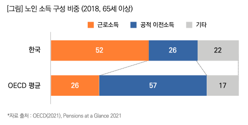 ‘한국과 OECD 국가 평균 노인 소득 구성비’를 살펴보면 OECD 평균은 연금 등 국가에서 지원해 주는 ‘공적이전소득(국가에서 정기적 또는 일시적으로 지원하는 각종 수당, 연금, 급여)’이 57%로 절반 이상을 차지하는 데 반해 한국은 26%로 OECD 평균의 절반 수준에 불과하고, ‘근로소득’에 집중되어 있음을 알 수 있다.
