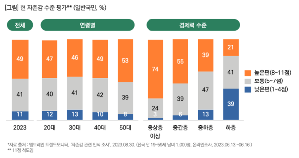 최근 엠브레인 트렌드모니터 조사 결과, 현재 자존감 수준을 스스로 평가토록 한 결과, 우리 국민의 절반 정도는 자존감 수준이 높은 편이라고 응답했다. 자존감 수준은 자기가 인식하는 경제력 수준과 상관성을 보였다. 즉 자신의 경제력이 높다고 인식할수록 자존감이 높은 경향을 보였다.