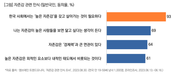 실제 ‘자존감에 영향을 미치는 요인’을 확인하고자 몇 가지 진술문을 제시하고 이에 대한 동의율을 물은 결과, ‘한국 사회에서는 높은 자존감을 갖고 살아가는 것이 필요하다‘고 생각하는 비율이 93%로 대다수였다.