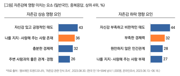 자존감 상승과 하락에 영향을 주는 요인 각각을 물은 결과, 자존감 상승 영향 요인으로는 ‘자신감 있고 긍정적인 태도’(43%), 자존감 하락 영향 요인은 ‘자신감이 부족하고 비관적인 태도’(44%)가 각각 1위로 꼽혔다.