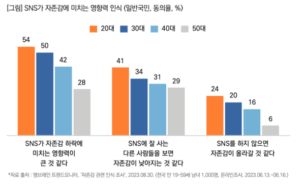 20대의 경우 ‘SNS가 자존감 하락에 미치는 영향력이 큰 것 같다’에 절반 이상(54%)이 그렇다고 응답했고, ‘SNS에 잘 사는 다른 사람들을 보면 자존감이 낮아지는 것 같다’에는 41%가 동의해 SNS상 타인과의 비교가 자존감 하락 요인으로 이어짐을 보여주었다.