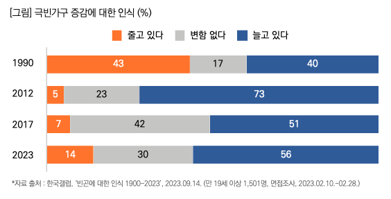1990년 조사에서는 극빈가구 증가와 감소 의견이 각각 40%, 43%로 팽팽히 맞섰으나, 1997년 IMF 외환위기, 2008년 글로벌 금융위기 등을 겪으며 2012년 조사에서는 극빈가구 증가 의견이 73%까지 치솟아 최고점을 찍었다.