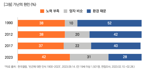 1990년 첫 조사에서만 해도 가난이 ‘환경 때문’이란 의견이 절반가량으로 가장 높았으나, 2012년부터는 ‘환경 때문’ 응답이 줄어들고 있는데, 올해는 ‘노력 부족’을 꼽은 비율이 처음으로 ‘환경 때문’을 앞섰다.